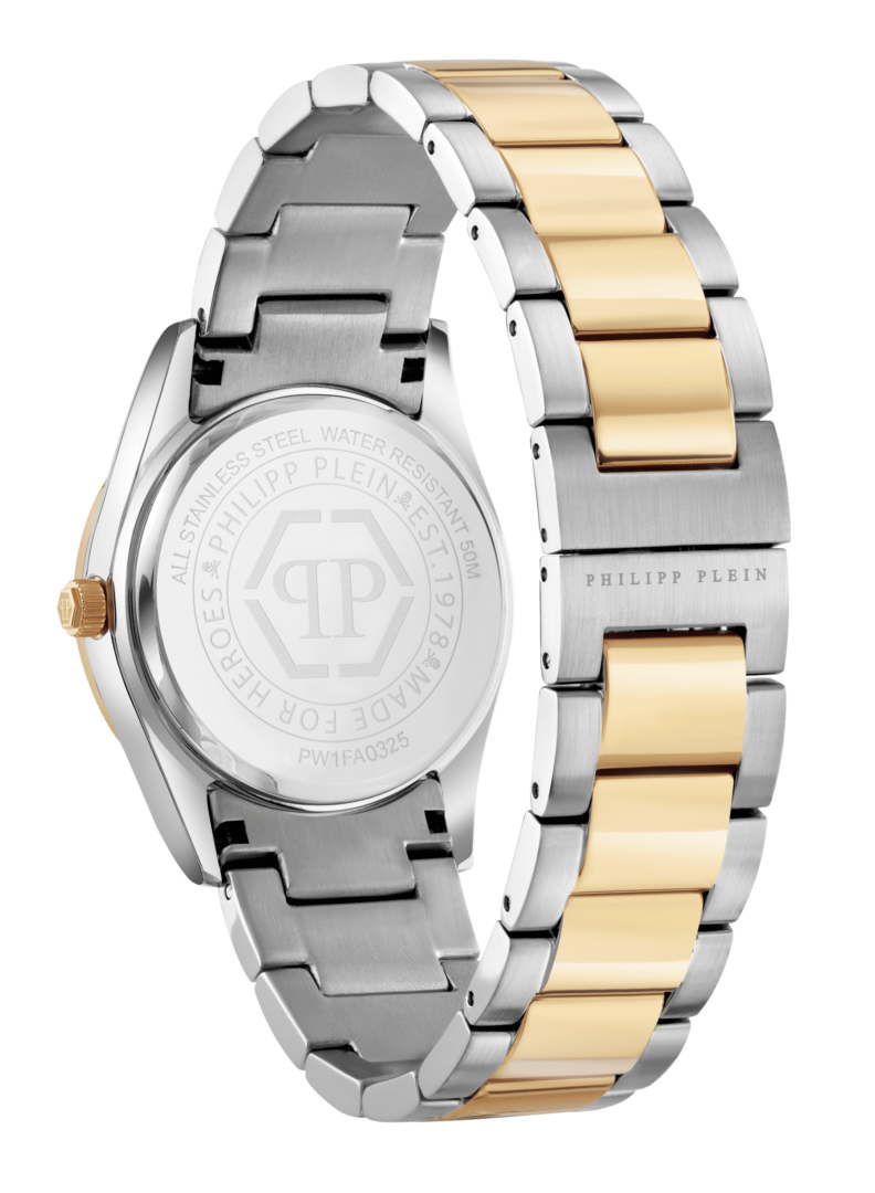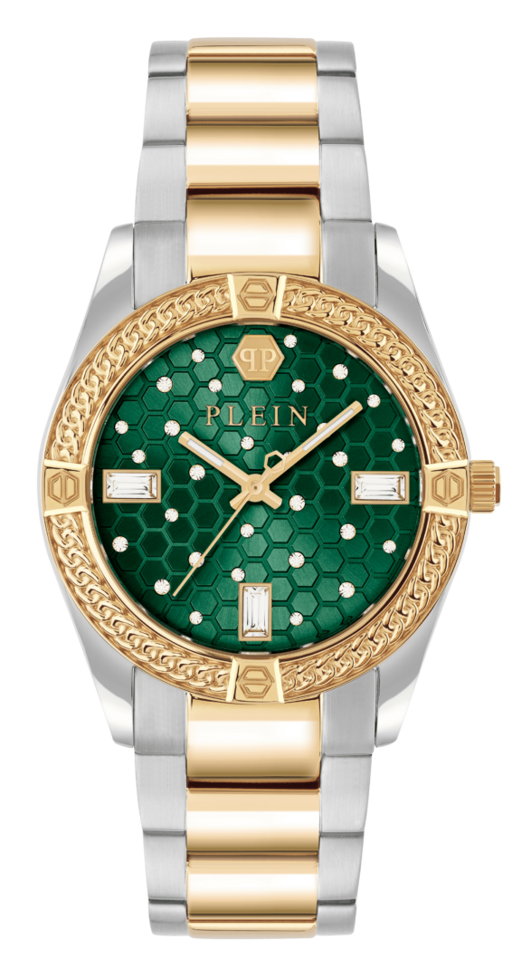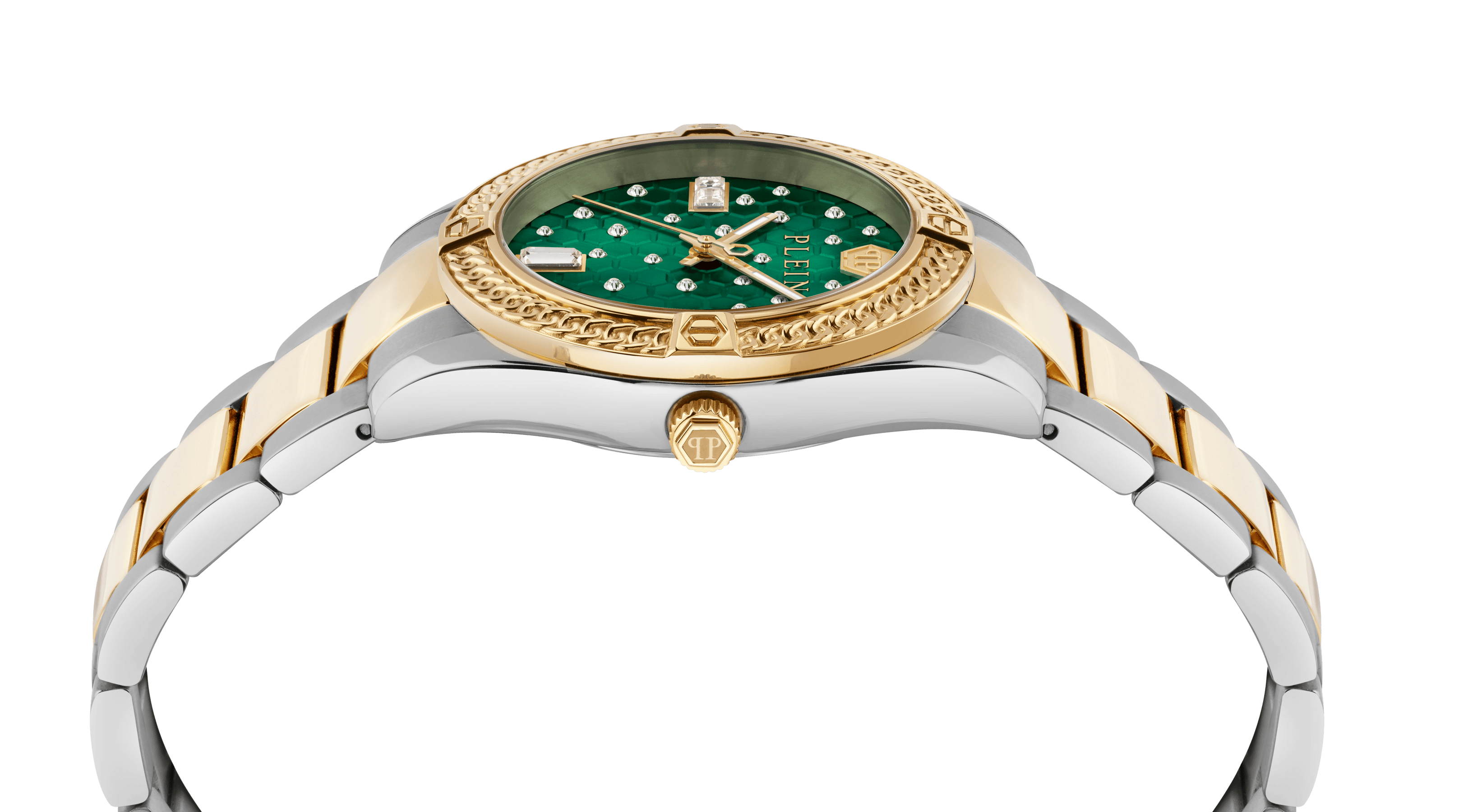 Δίχρωμο αναλογικό ρολόι χρονογράφου με μπρασελέ,Philipp Plein, της σειράς ICON CHAIN LADY. Έχει πράσινο καντραν 36χιλιοστών με λευκές πέτρες και χρυσό περίγραμμα. Ένα all time classic ρολόι με προσοχή στις λεπτομέρειες και στην ποιότητα.