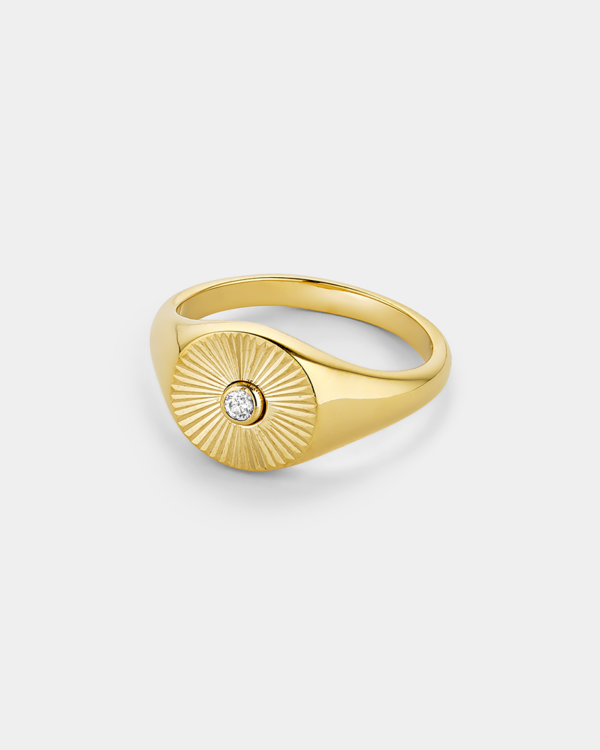 Ένα δαχτυλίδι signet με ανάγλυφο σχέδιο και ζιργκόν, από την εταιρεία Vogue. Το υλικό είναι ασήμι 925 με κίτρινο χρυσό επιμετάλλωση 18καρατίων.