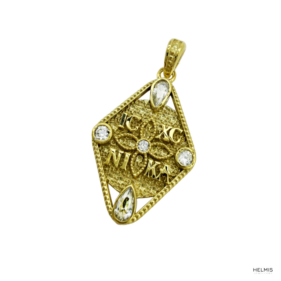 Στην μία όψη έχει τα αρχικά του Ιησους Χριστός Νικά, διακοσμημένα με πέτρες και στην άλλη όψη έχει τους Αγίους Κωνσταντίνο και Ελένη.
