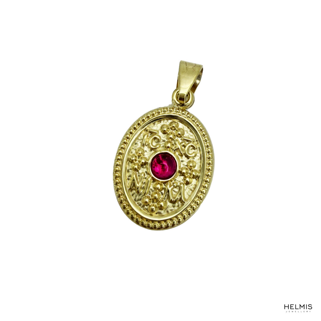 Στην μία όψη έχει τα αρχικά του Ιησους Χριστός Νικά, διακοσμημένo με μία φούξια πέτρα και στην άλλη όψη έχει τους Αγίους Κωνσταντίνος και Ελένη.