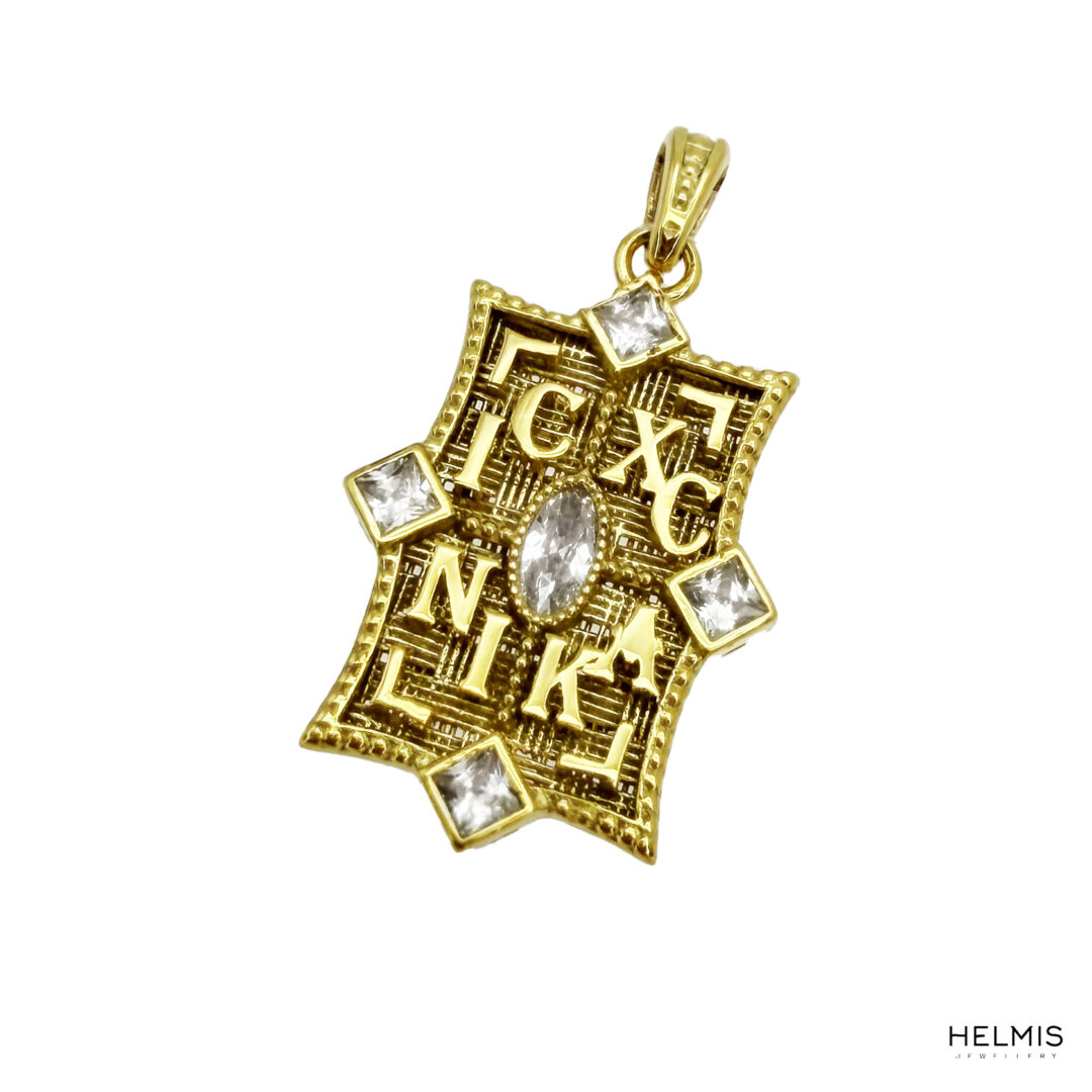 Στην μία όψη έχει τα αρχικά του Ιησους Χριστός Νικά, διακοσμημένα με πέτρες και στην άλλη όψη έχει σχέδιο με λευκές πέτρες