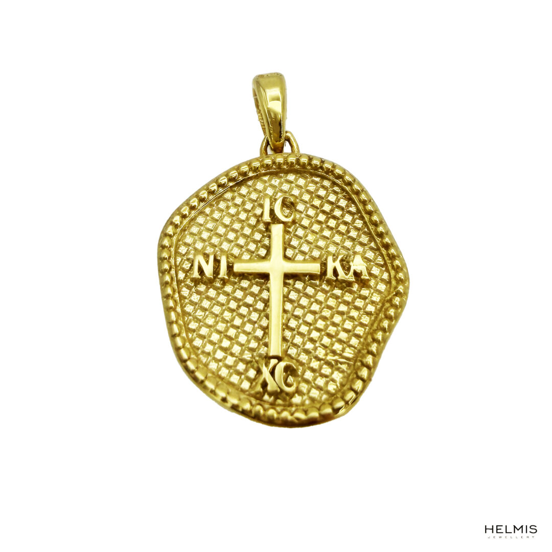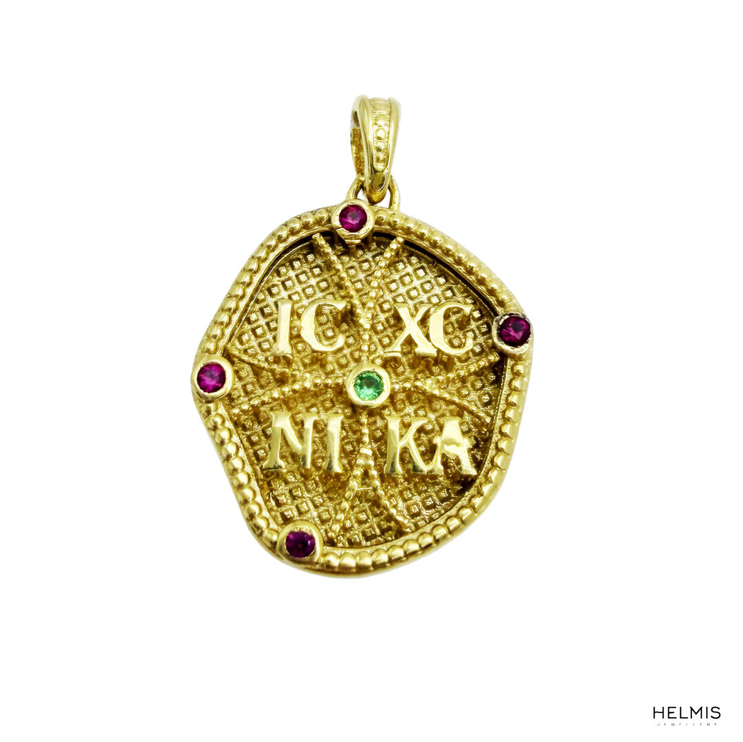 Στην μία όψη έχει τα αρχικά του Ιησους Χριστός Νικά, διακοσμημένα με πέτρες και στην άλλη όψη έχει έναν σταυρό και τα αρχικά